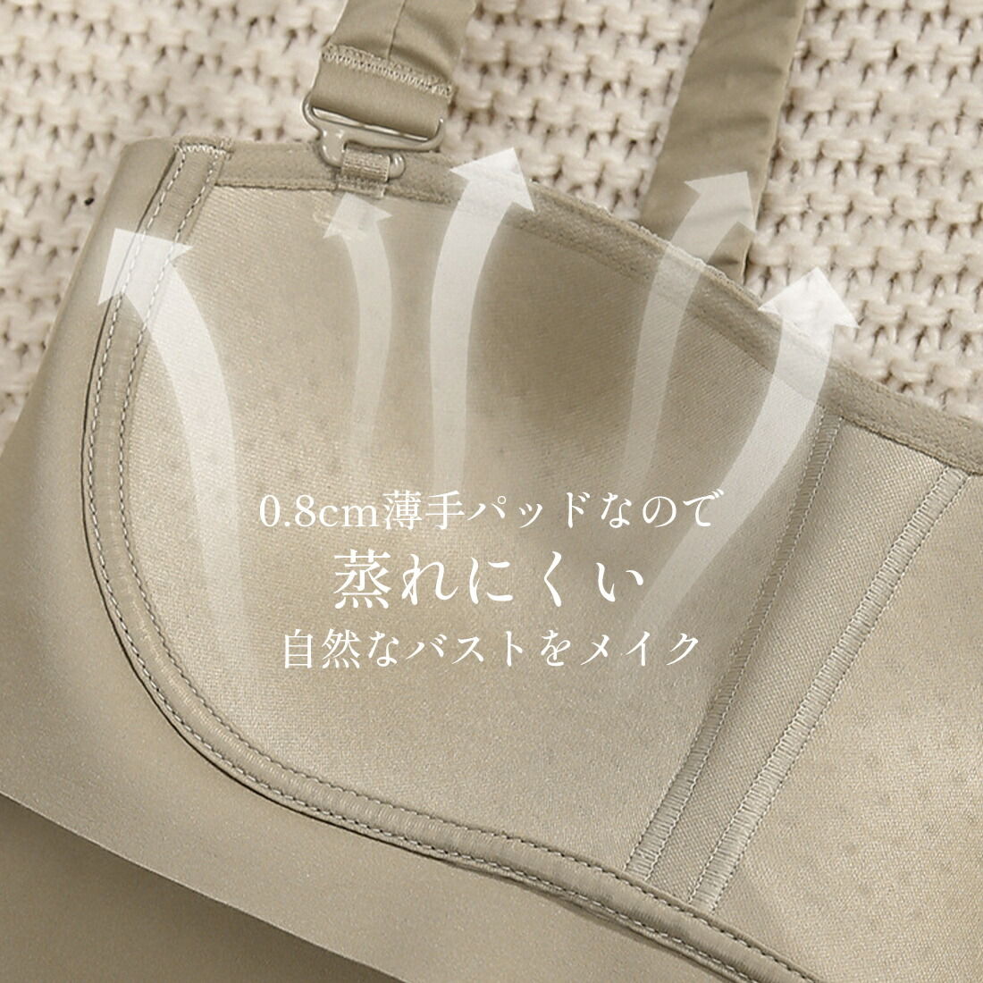0.8cmの薄手パッドで自然なバストをメイクしながら蒸れにくい。ワイヤレスでもバストをしっかりホールド、シーンを選ばず1日中着ていられます。