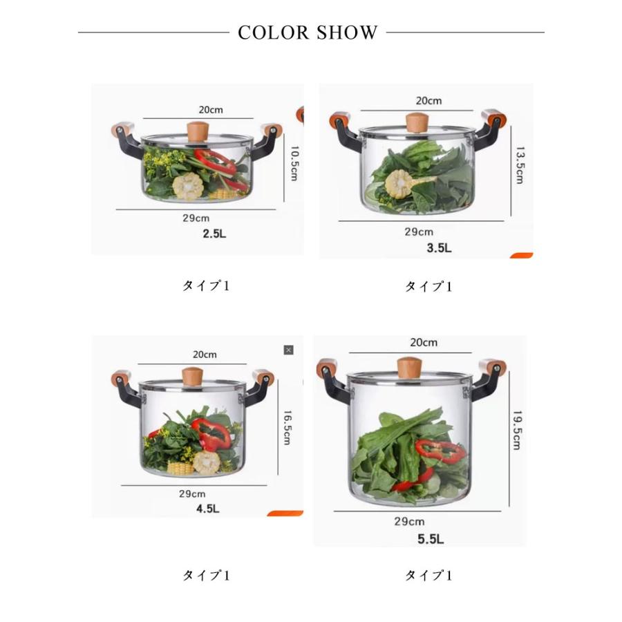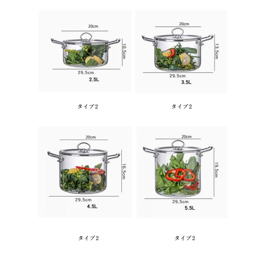 直火加熱対応!サイズ2.5L 3.5L 4.5L 5.5Lサイズについての説明サイズ:タイプ1:容量2.5L:口径20cm 底径29cm 高さ約10.5cm容量3.5L:口径20cm 底径29cm 高さ約13.5cm容量4.5L:口径20cm 底径29cm 高さ約16.5cm容量5.5L:口径20cm 底径29cm 高さ約19.5cmタイプ2:容量2.5L:口径20cm 底径29.5cm 高さ約10.5cm容量3.5L:口径20cm 底径29.5cm 高さ約13.5cm容量4.5L:口径20cm 底径29.5cm 高さ約16.5cm容量5.5L:口径20cm 底径29.5cm 高さ約19.5cm※サイズ計測には誤差が生じます。※サイズ計測には誤差が生じます。素材ガラス色タイプ1 タイプ2備考●サイズ詳細等の測り方はスタッフ間で統一、徹底はしておりますが、実寸は商品によって若干の誤差(1cm 3cm )がある場合がございますので、予めご了承ください。