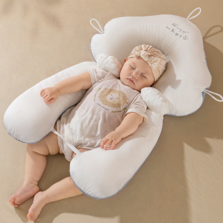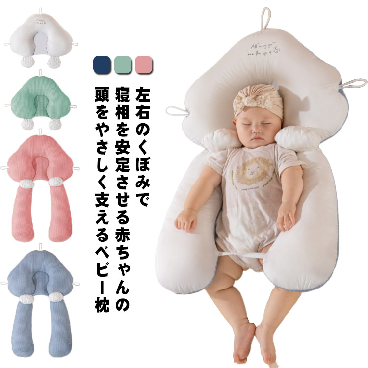 左右のくぼみで寝相を安定させる赤ちゃんの頭をやさしく支えるベビー枕。