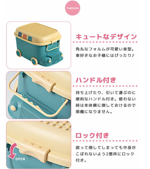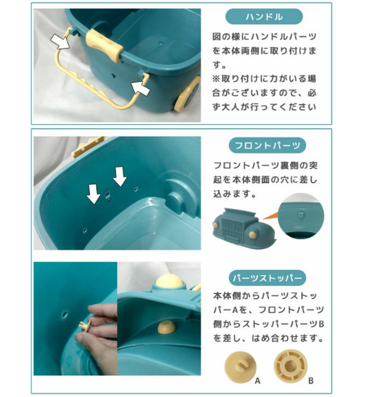付属品 本体、フタ、タイヤパーツ…4個、ハンドルパーツ…2個、ロックパーツ…2個、フロントパーツ…1個、パーツストッパーA…2個、パーツストッパーB…2個、組み立て説明書