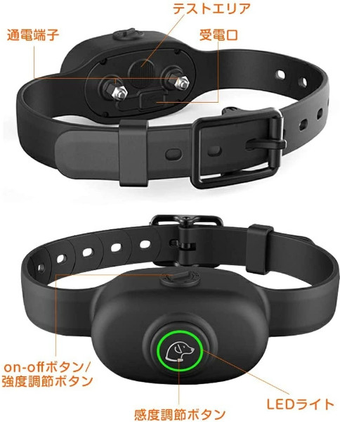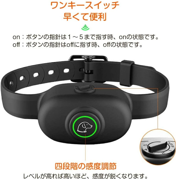 リモコン式の無駄吠え防止グッズと比べて、この無駄吠え防止グッズはワンキースイッチ式でです。操作ボタンは首輪の上で、onになるのは早くて便利です。 写真のように、ボタン指針はoffに指すとき、犬躾首輪本体はoffの状態です。