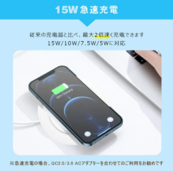 高速充電の15Wと10W、7.5W・5Wの三つの標準充電モードに対応。電力転換効率は70%以上。