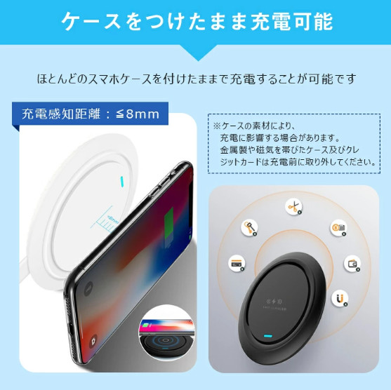 ケースをつけたままでも充電ができるように設計されています。ただし、約8mm以上の厚みがあるケースや金属製ケースや磁気ケース、およびクレジットカードなどは、充電前に取り外してください。
