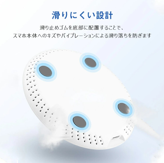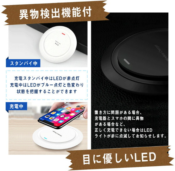 QI対応デバイスまたはQI対応レシーバーを付けたデバイスを本体の上に置くだけで急速充電できるワイヤレス充電器です。