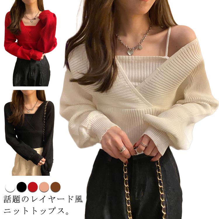レイヤード風 ニット ショート トップス 重ね着風 ニットセーター カジュアルレディースファッション トップス ニット セーター セーター