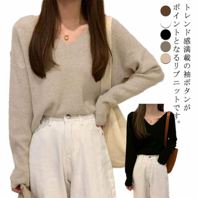 きれいめ 長袖 レディース リブニット 秋 体型カバー 冬 トップス Vネック 袖ボタン ゆったり 防寒 カジュアル ニットトップス 暖かい セーター 大人 おしゃれ 秋服 冬服