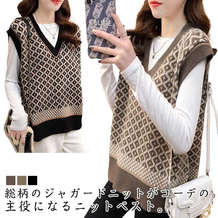 重ねる ニット ベスト 幾何学柄 模様編み ジャガード ニットベスレディースファッション トップス ニット セーター セーター