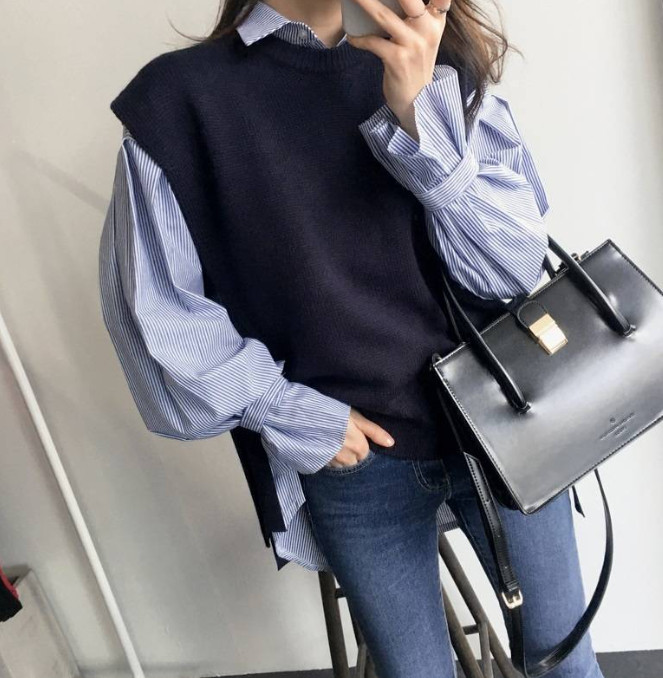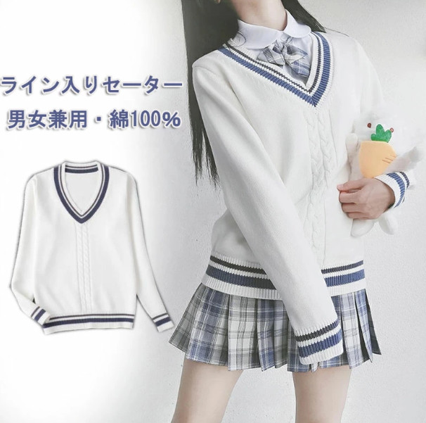 配色ライン+フロント部分に入ったケーブル編みがポイントのVネックセーターで制服コーデをもっと可愛く
