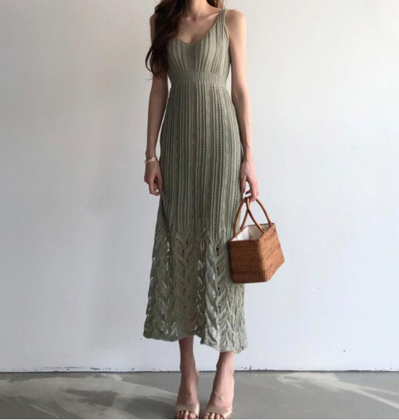 ニットワンピース サマーニットキャミソールワンピースロングワンピマキシワンピース夏タイトワンピースvネック袖なし