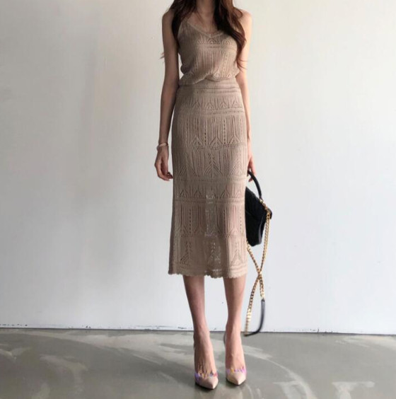ニットセットアップサマーニットキャミソールノースリーブニットタンクトップスカートセットトップス レディース ロングスカートミモレ丈スカートタイトスカート通勤 オフィス裏地ありゴムウェストブラウンホワイ