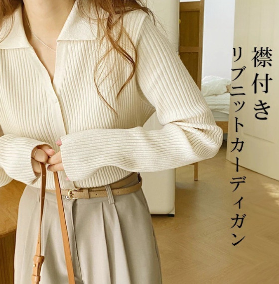 襟付きデザインが可愛い、リブニットカーディガン 深めvネックでシャープな印象へと導く1着 レディースファッション トップス ニット セーター ニットパーカー
