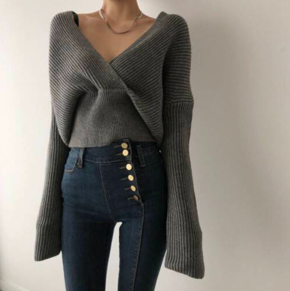 2色 トップス レディース セーター ニット リブ ショート カシュクール ネック 長袖 セクシー 大人カジュアル きれいめ ドロップショルダー ボリューム袖 ショ