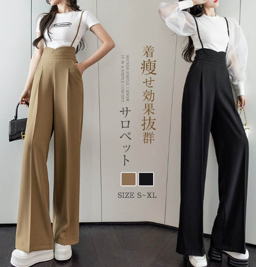 レディース サロペット パンツ レディース ロング 春夏秋 きれいめゆったりワイドパンツ オールインワン 黒 ブラック