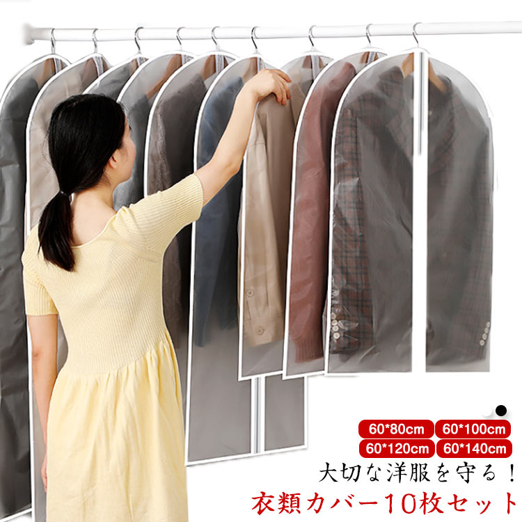 洋服カバー ロング 衣類カバー 10枚組 ホワイト ブラック 4サイズ スーツサイズ 衣類収納 スーツカバー コートカバー 埃よけ 防湿 防塵 型崩れ防止 通気 クリア ファスナー付き 整 服のカバー