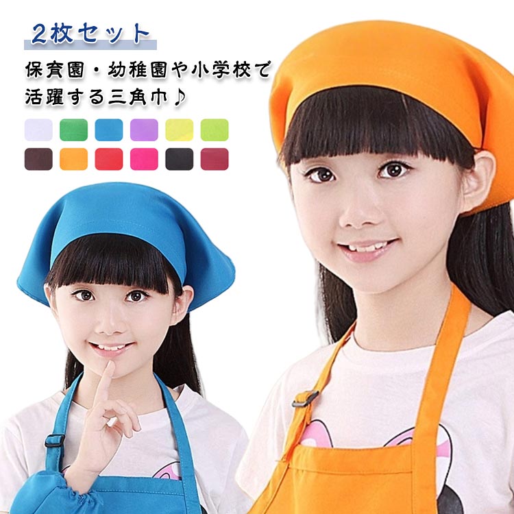 三角巾 子供用 2枚セット マジックテープ付き 自分でかぶれる 着脱簡単 バブーシュカ バンダナ シンプル かわいい 無地 給食 家庭科 調理実習 お菓子作り クッキング 幼児 男の子 女の子 キッズ