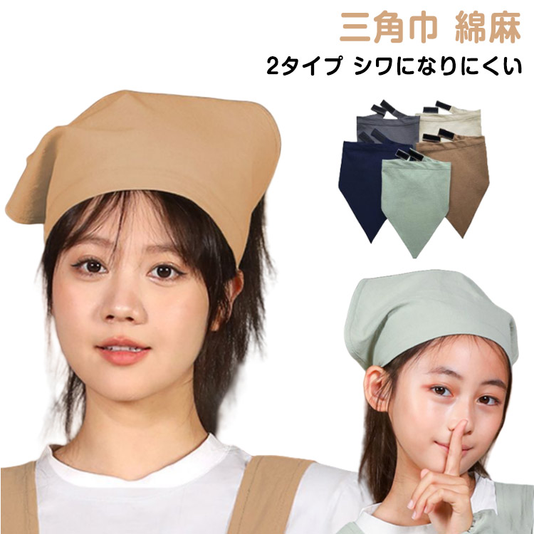三角巾 シンプル バブーシュカ 2枚セット 綿麻 2タイプ シワになりにくい キッチン用 仕事用 料理教室 家庭用 カフェ シワになりにくい三角巾 洗濯可 三角巾大人 マジックテープ