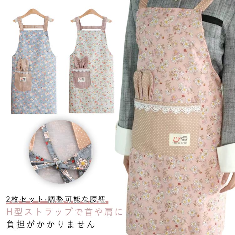 エプロン 2枚セット キッチンエプロン ポケット付き 花柄 エプロン うさ耳 調整可能な腰紐 女性用 料理 エプロン 型ストラップ 可愛い 丈夫 汚れ防止 誕生日 プレゼント ギフト