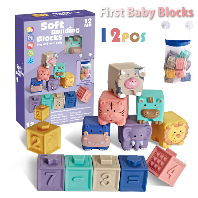 音の出るおもちゃ ブロック 赤ちゃん 子供 知育玩具 音が鳴る 柔らかい ライオン 象 河馬 乳牛 牛 虎 ベビー向けおもちゃ ソフトブロック はじめての積み木 寅年 12pcs