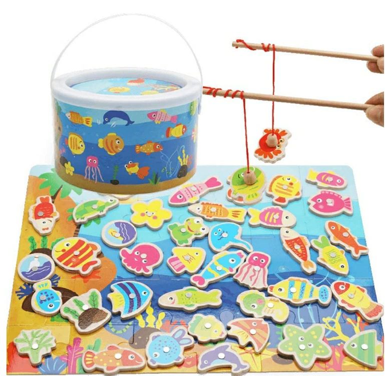 マグネット式釣りゲーム木製パズル知育玩具親子ゲーム子供おもちゃ楽しいおもしろい魚釣りバケツ安全無毒水なし釣り竿