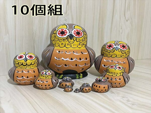ロシア民芸品マトリョーシカ 土産物 手作り人形 手描き フクロウ オブジェ 10個組 木製 インテリア雑貨 洋風 可愛い ギフト プレゼント キッズ おもちゃ ハロウィン クリスマス