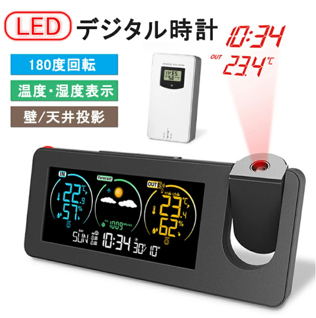 デジタル時計 多機能時計 目覚まし時計 時計 スヌーズ クロック 置き時計 壁 天井投影 温度 湿度 プロジェクター アラーム 携帯充電 自動輝度調節 投影180度回転調整可能