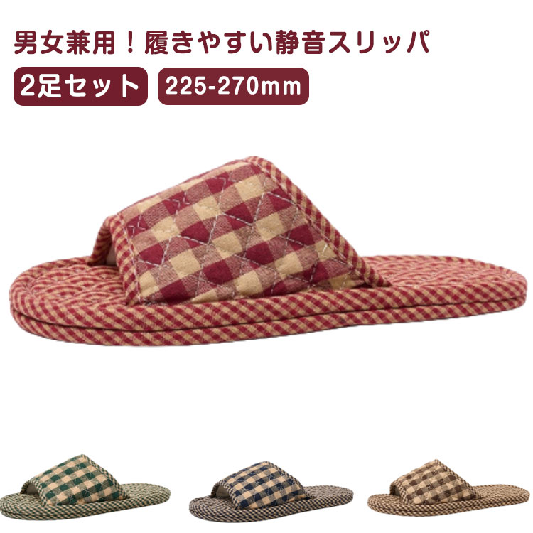 男女兼用 2足セット 静音スリッパ 蒸れない 前あき 軽量 チェック柄