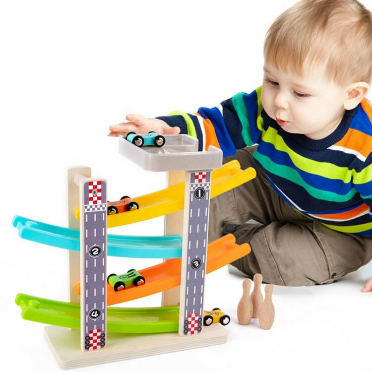 くるくるスロープ 木製 スロープ滑空レースカー 滑り台 滑空車 はしご4階 軌道4つ 車4台付属 ボウリング 駐車場付き
