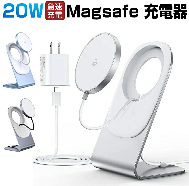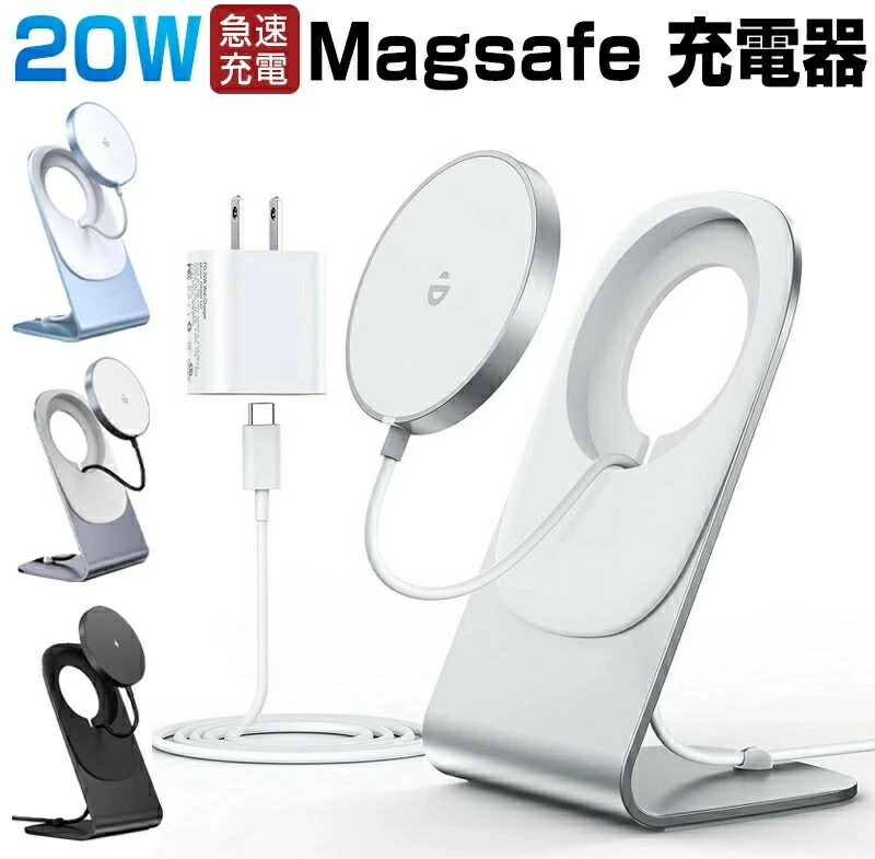 magsafe充電器 ワイヤレス充電器 マグネット式 iPhone15 14 13 12シリーズ対応 ワイヤレス充電スタンド 20W USB-Cアダプター付属 USB-Cケーブル付き 急速ワイヤレス充