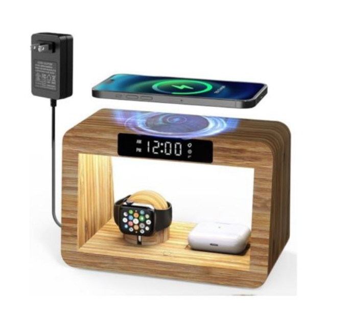 目覚まし時計 光 ワイヤレス 3in1 ワイヤレス充電器 デジタル時計 Iphone Samsung Qi対応 携帯電話 Apple Watch Airpods充電用 竹製スタンド デジタル時計 授乳