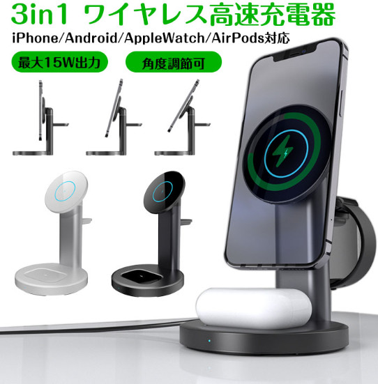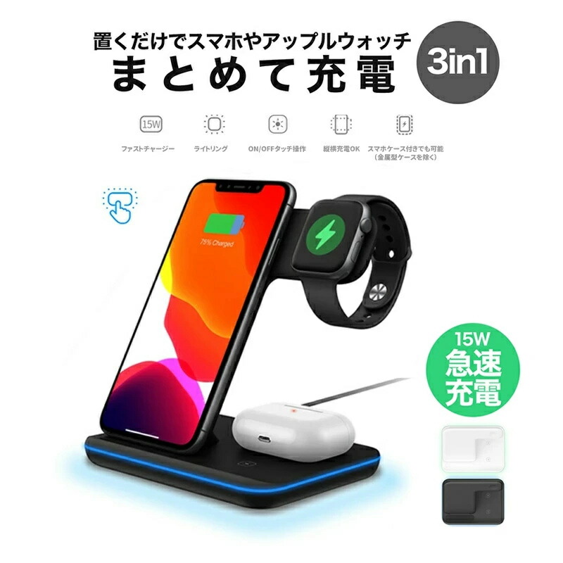 3in1 急速充電 iPhone14 13 12 miniPro ProMax 、AppleWatch 7 6 5 4 3 2 1、AirPodsPro対応 最大15W出力 ケース付けも充電可能