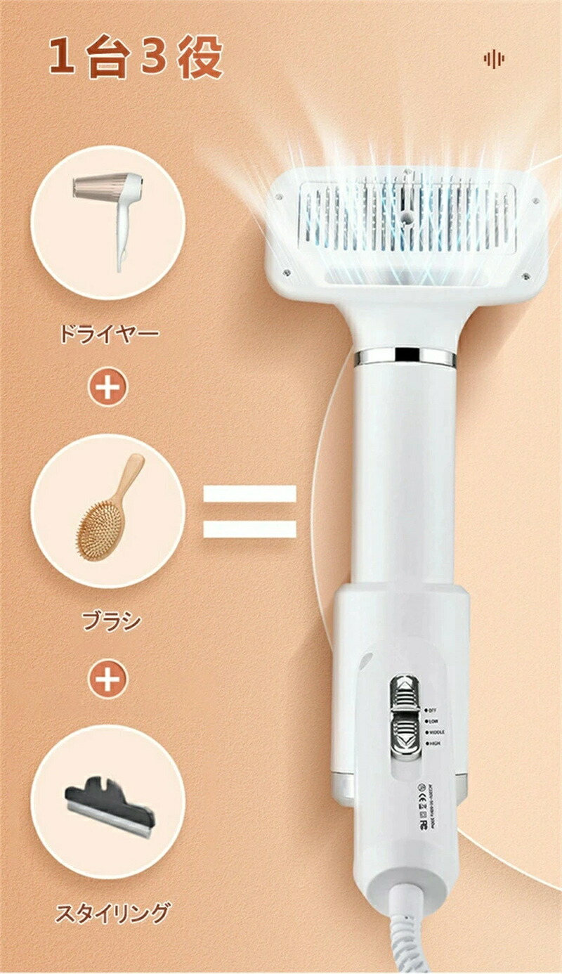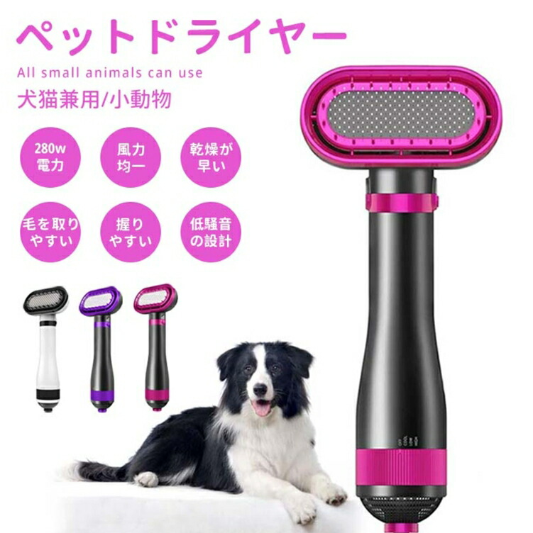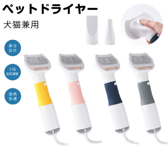 3in1ペットドライヤー ペットブラシ ペットドライヤー 交換ヘッド2個付き ペットヘア乾燥機 猫犬用 3段階温度調整可能 恒温過熱保護 超軽量 静音 速乾性