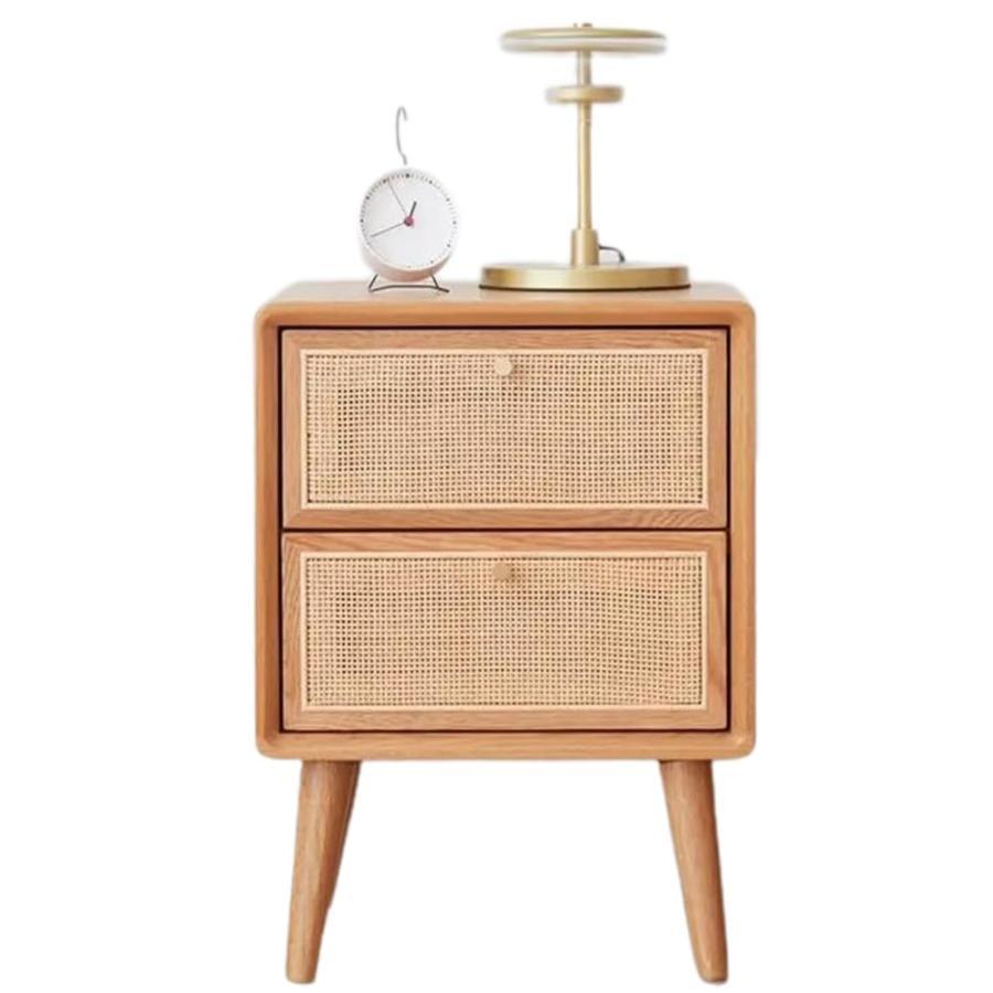 全無垢材ベッドサイドテーブル ナイトテーブル サイドテーブル ラタン純無垢材北欧モダンミニマリスト収納棚スモールオフィス寝室 引き出し付きオーク材 ナチュ