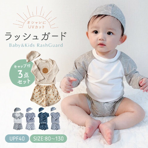ラッシュガード カット 3点セット 上下セット キッズ ベビー 長袖 紫外線防止 紫外線対策 キッズ 水着 帽子 トップス 男の子 女の子 おしゃれ 海 プール 80 90 100 110