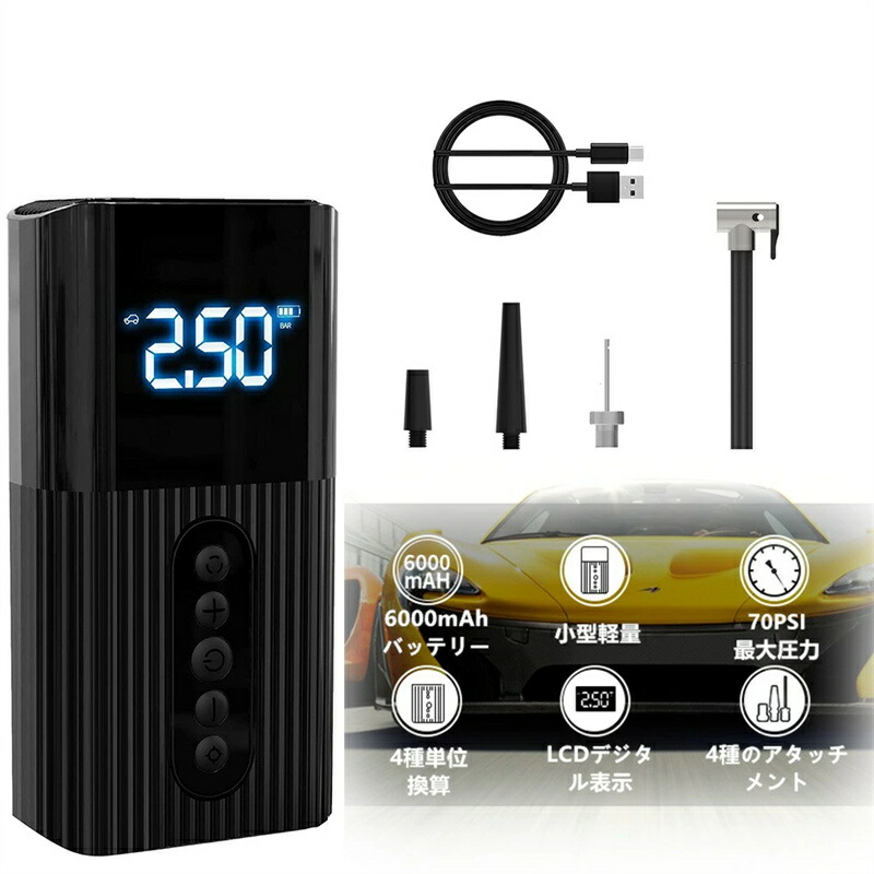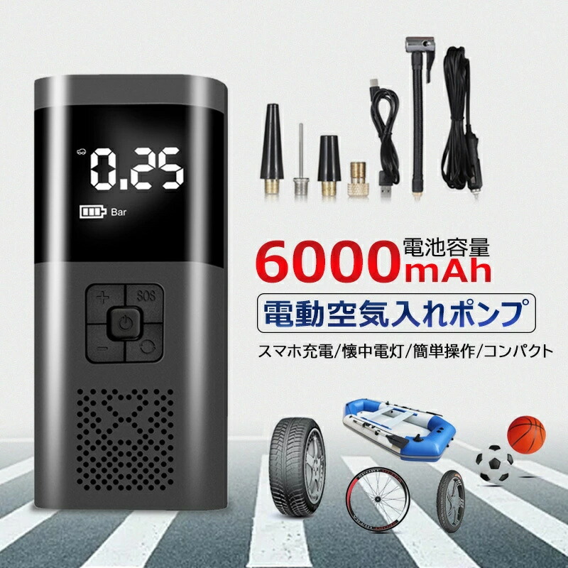 電動空気入れ エアコンプレッサー 電動エアーポンプ 6000mAh大容量バッテリー コードレス 充電