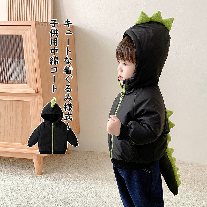 中綿コート キッズ 子供 フード付き 子供用 キッズ服 子供服 キッズコート キッズアウター 子供コート 子供アウター 恐竜模様 可愛い スペシャル デザイン性 アウター 上着 暖かい 黒 前開き ポ