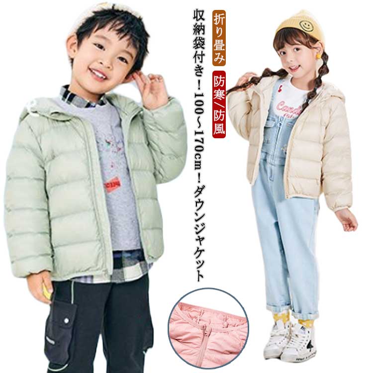 キッズ服 ダウンジャケット ダウンコート 女の子 男の子 アウター 子供服 収納袋 折り畳み フード付き 冬服 防寒 防風 無地
